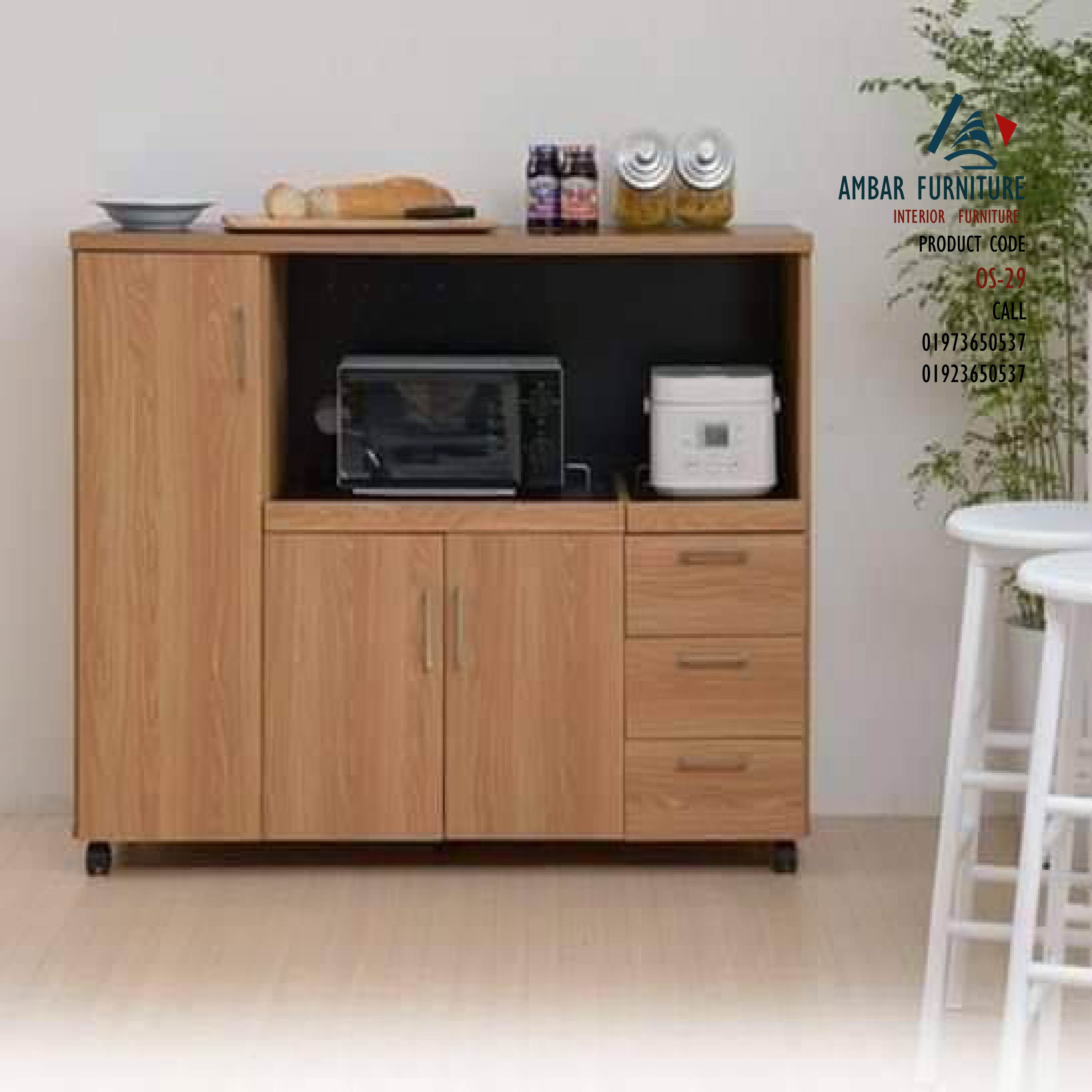 মাঝখানে একটি ওপেন শেলফ (রাইস কুকার, ওভেন ইত্যাদির জন্য), উপরে খোলা প্ল্যাটফর্ম ও নিচে ক্যাবিনেট স্টোরেজ।